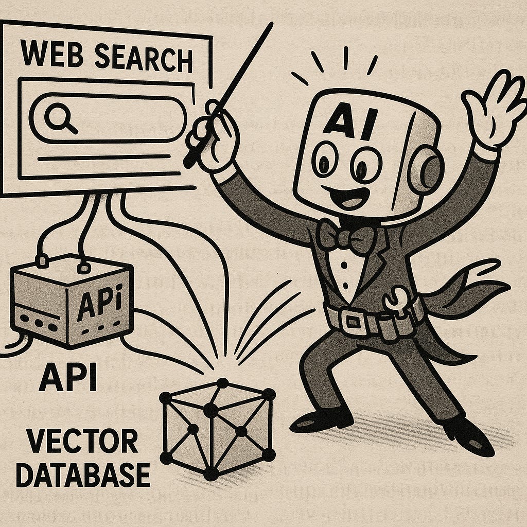 Imagina que la IA es un director de orquesta. No toca todos los instrumentos, sino que sabe cuándo darle la señal al violín, al piano o a la percusión. En este caso, las herramientas podrían ser: